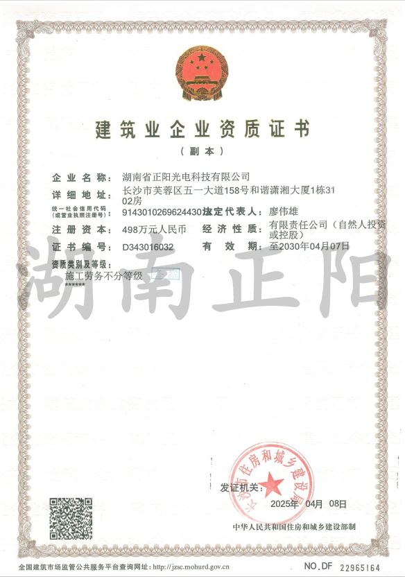 湖南省正陽光電科技有限公司是一家從事亮化工程及大型燈光藝術的設計、制作、安裝和維護于一體的專業化公司。公司資質齊全、管理嚴謹、技術先進、實力雄厚,取得了城市及道路照明工程專業承包壹級資質、照明工程設計專項甲級資質、機電工程施工總承包貳級資質、施工勞務等資質,榮獲“重質量·守誠信”示范企業。